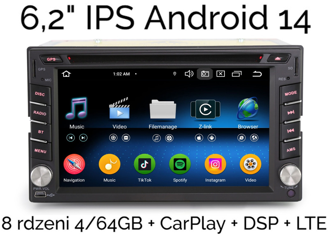 6,2" UNIWERSALNE RADIO 2DIN NAWIGACJA ANDROID 14 4/64 GB DSP CARPLAY LTE CD DVD