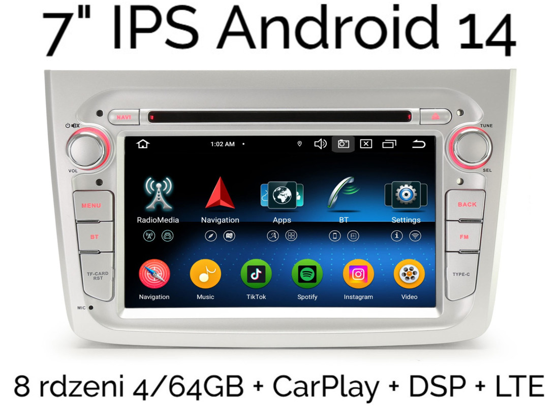7" RADIO 2DIN NAWIGACJA ANDROID 14 ALFA ROMEO MITO 4/64 GB DSP CARPLAY LTE CD DVD